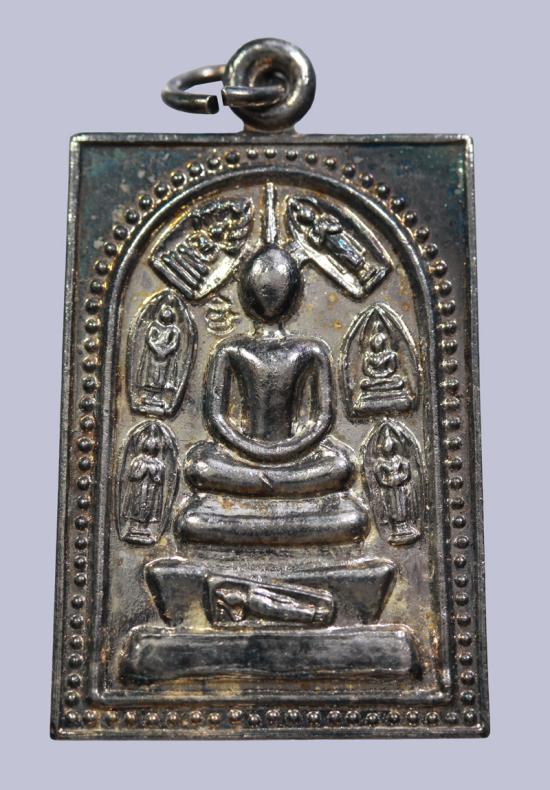ด้านหน้า: เป็นรูปจำลองพระสมเด็จฐาน 3 ชั้น นั่งสมาธิบนอาสนะ ลวดลายงดงามตามพุทธศิลป์