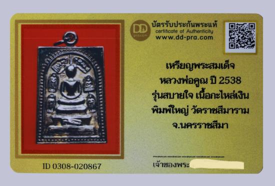 หรียญพระสมเด็จ หลวงพ่อคูณ ปี 2538 รุ่นสบายใจ เนื้อกะไหล่เงิน พิมพ์ใหญ่ วัดราชสรมาราม จ.นครราชสีมา น่าบูชามากๆค่ะ+บัตร