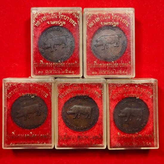 เหรียญหมูเสริมดวงอุดมโชคปลอดภัยหลวงพ่อเปิ่น วัดบางพระ ปี2541 จำนวน 5 องค์ มีกล่อง แดงเคาะแรก |