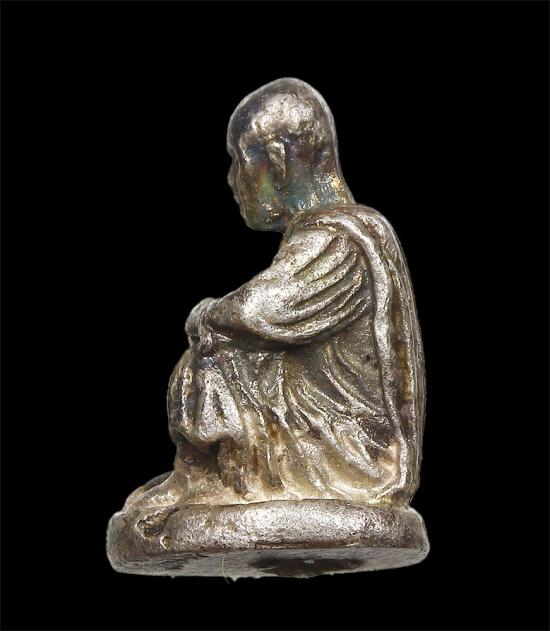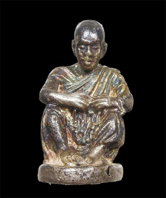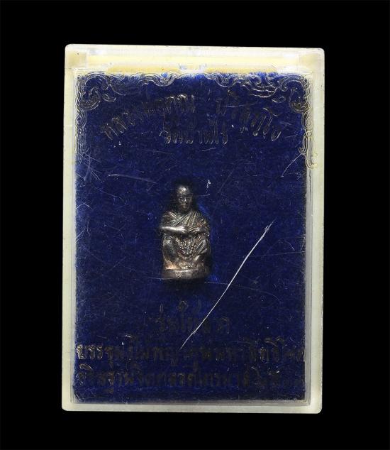 รูปหล่อเหมือนนั่งบริกรรมคาถา พิมพ์เล็ก รุ่น ให้ลาภ บรรจุผงไม้พญาคูนมหาสิทธิโชค อฐิษฐานจิตตลอดไตรมาส วัดบรูพ์ ( เนื้อเงิน ) พ.ศ.2533 กล่องเดิม