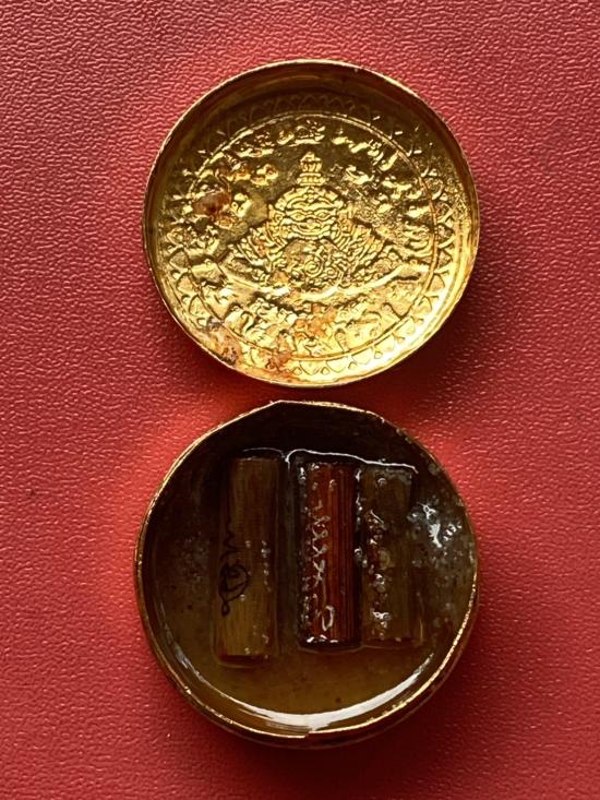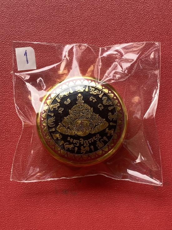 เคาะเดียวแดง สีผึ้งพระราหู รุ่น มงคลจักรวาล เนื้อ โลหะชุบทองลงยาสีดำขอบสีแดง ขนาด 3.2ซม |