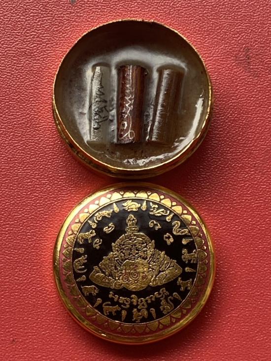 เคาะเดียวแดง สีผึ้งพระราหู รุ่น มงคลจักรวาล เนื้อ โลหะชุบทองลงยาสีดำขอบสีแดง ขนาด 3.2ซม |