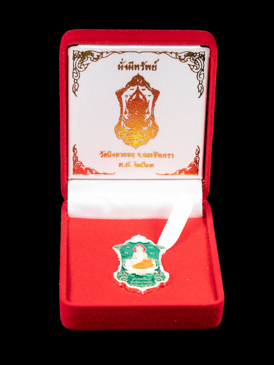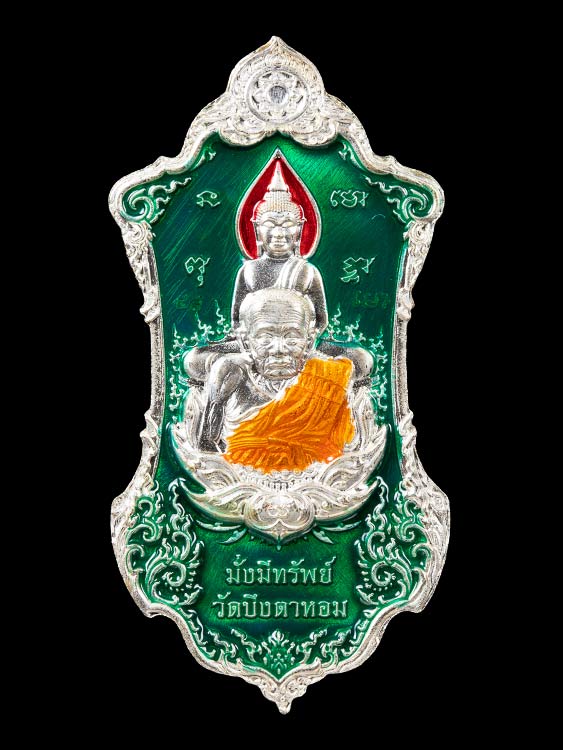 เหรียญท้าวเวสสุวรรณ พระครูอนุวัตรบวรกิจ วัดบึงตาหอม จ.ฉะเชิงเทรา พ.ศ.2563 เนื้อเงินลงยาสีเขียว 2 หน้า สภาพสวยพร้อมกล่องเดิม
