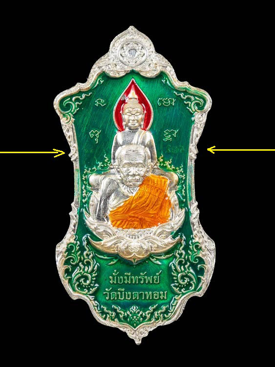 เหรียญท้าวเวสสุวรรณ พระครูอนุวัตรบวรกิจ วัดบึงตาหอม จ.ฉะเชิงเทรา พ.ศ.2563 เนื้อเงินลงยาสีเขียว 2 หน้า สภาพสวยพร้อมกล่องเดิม