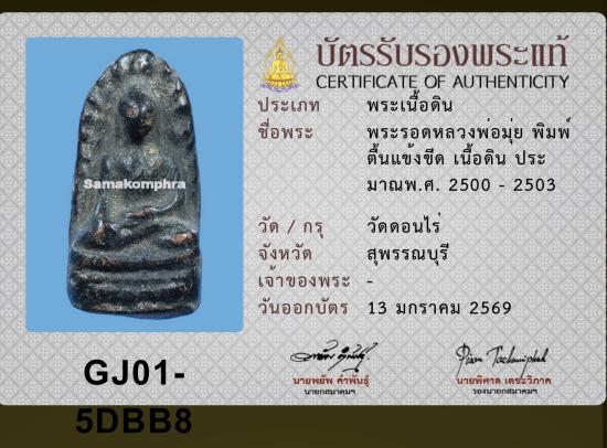 พระรอดหลวงพ่อมุ่ย วัดดอนไร่ พิมพ์ตื้นแข้งขีด เนื้อดิน ประมาณพ.ศ. 2500 - 2503 พร้อมบัตรรับรองสมาคม