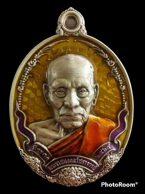 เนื้ออัลปาก้าซาติน ลงยาเหลือง โบว์ม่วง เหรียญที่ระลึก หลวงพ่อพัฒน์ วัดห้วยด้วน