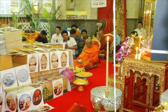 หลวงปู่เจือ ประกอบพิธี ณ วิหารบูรพาจารย์วัดกลางบางแก้ว เบื้องหน้ารูปหล่อ หลวงปู่บุญ หลวงปู่เพิ่ม เมื่อวันที่ 3 สิงหาคม 2551