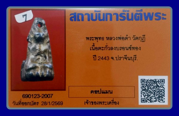 บัตรการันตี -1200- นิยมฝังเขียงหมาป่า พระพุทธเนื้อตะกั่วลงบรอนซ์ หลวงพ่อดำ วัดกุฏิ จ.ปราจีนบุรี