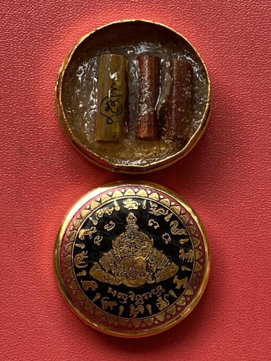 เคาะเดียวแดง สีผึ้งพระราหู รุ่น มงคลจักรวาล เนื้อ โลหะชุบทองลงยาสีดำขอบสีแดง ขนาด 3.2ซม |