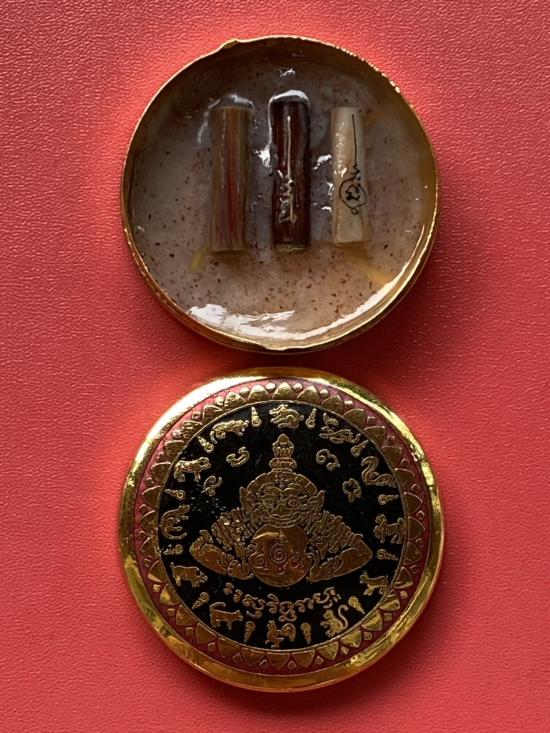 เคาะเดียวแดง สีผึ้งพระราหู รุ่น มงคลจักรวาล เนื้อ โลหะชุบทองลงยาสีดำขอบสีแดง ขนาด 5ซม |