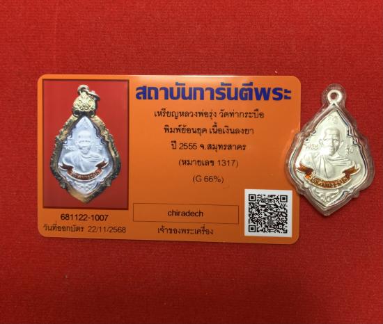 เหรียญหลวงพ่อรุ่ง วัดท่ากระบือ เนื้อเงินลงยา ปี 2555