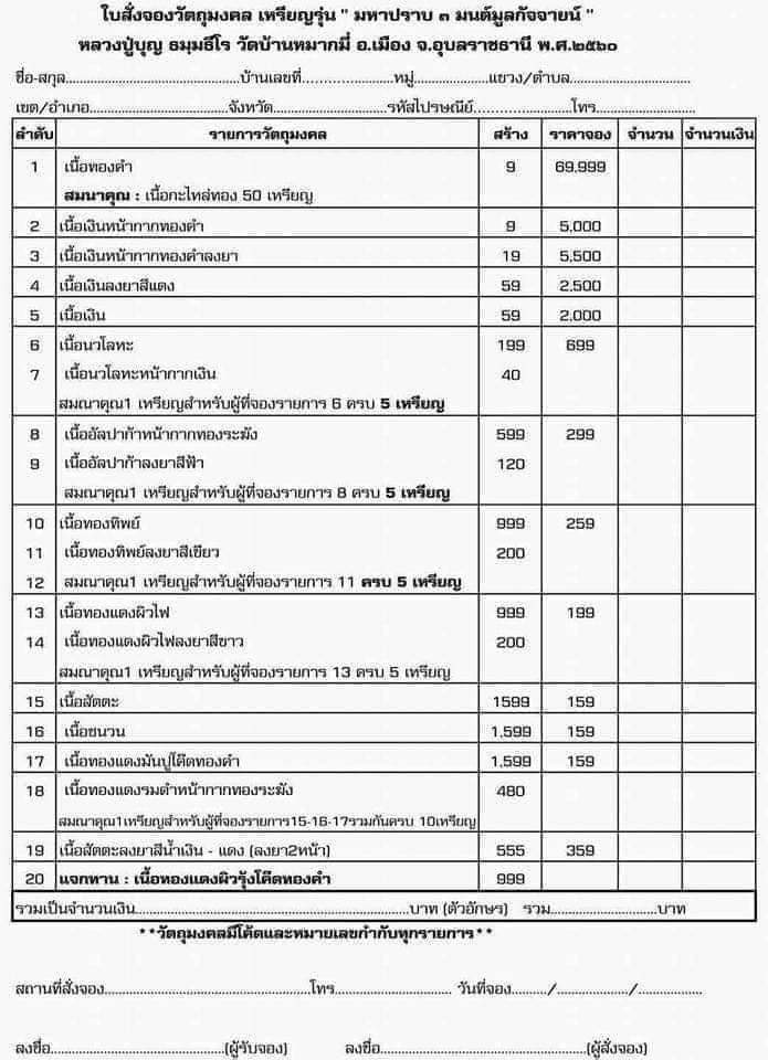 แบ่งปันเหรียญมหาปราบ๓ มนต์มูลกัจจายน์ หลวงปู่บุญ ธมฺมธีโร วัดบ้านหมากมี่ อุบลฯ.ปี60 เนื้อทองทิพย์ ราคาจองอองค์ละ259บาท ชุด5องค์ ซีนเดิมลุ้นหมายเลขสวยๆ แท้ทันประกันให้