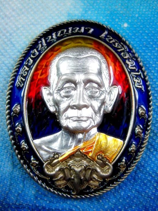เหรียญ รุ่นให้พร เนื้ออัลปาก้าลงยาไล่สีน้ำเงินแดงเหลือง ขอบน้ำเงิน หลังลงยาไล่สี นำเงินเหลือง หน้ากากเงิน ลงยาจีวร (---A60---) |