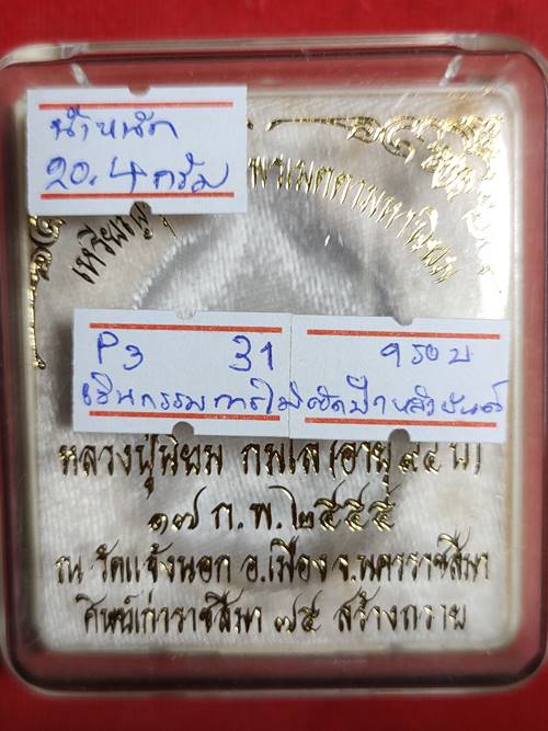 เหรียญหลวงปู่นิยม กมโล รุ่น เจริญพรเมตตามหานิยม ออกวัดแจ้งนอก ปี 2555 เนื้อ เงินพิมพ์กรรมการไม่ตัดปีกหลังยันต์ พิเศษ ตอกโค๊ต 9 รอบ หมายเลข 31 สภาพสวย เคาะเดียวแดง |