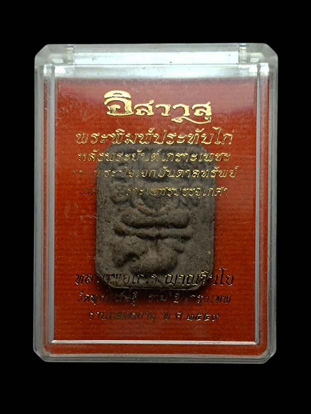 พระพิมพ์หลวงพ่อปาน พระพิมพ์ประทับไก่ หลังพระยันต์เกราะเพชร รุ่นพระปัจเจกบันดาลทรัพย์ เนื้อผงเกราะเพชรบรรจุเกศา หลวงพ่อเณร วัดทุ่งเศรษฐี ปี พ.ศ. 2559 จ.กรุงเทพมหานคร มวลสารอย่างดีผสมเกศา