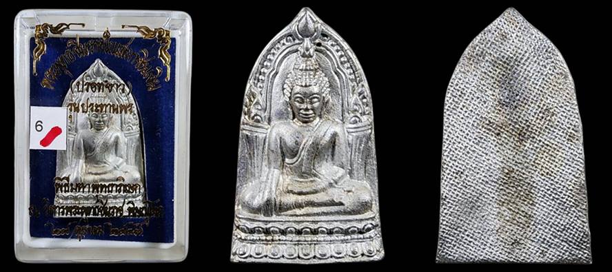 พระพุทธชินราชใบเสมา รุ่นประทานพร เนื้อชินเงิน หรือเนื้อปรอทขาว จัดสร้างขึ้นในปี 2547 มาพร้อมกล่องเดิมจากวัดครับ ข้างหลังด้านล่างตอกโค้ด นะ ขนาดองค์พระ สูง 4.0 ซม. กว้าง 2.5 ซม.ครับ 6 |