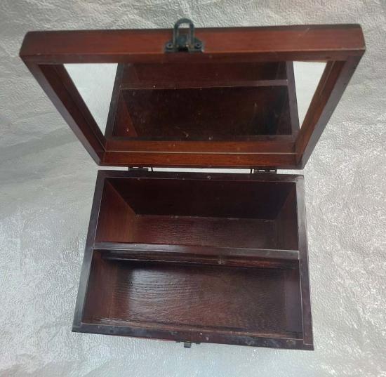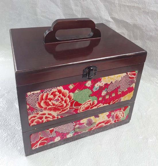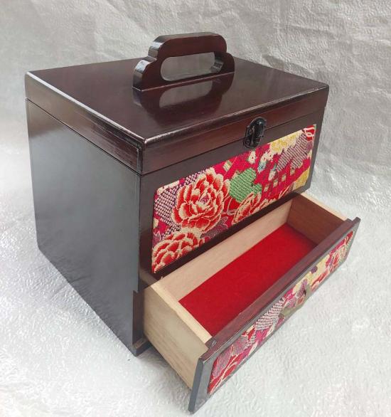กล่องไม้โบราณสไตล์ญี่ปุ่น ทำจากไม้เคลือบเงา ตกแต่งด้วยผ้าทอกิโมโน 1 ลิ้นชัก ขนาด 9.5*7 สูงรวมหู 9.5 นิ้ว