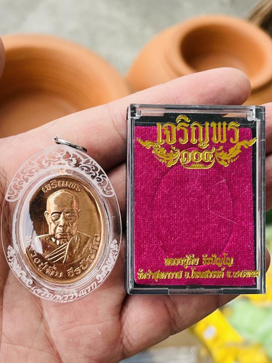 เจริญพรบนรุ่นเเรก เนื้อทองเเดง หลังเรียบ ตอกเเจกในพิธี พร้อมเลี่ยม กล่องเดิมครบ เลข 540 |