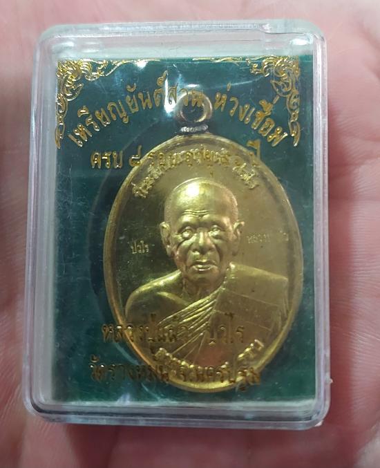 เหรียญยันต์สวนห่วงเชื่อม ครบ 8 รอบ 96 ปี หลวงปู่แผ้ว ปวโร วัดรางหมัน ปี 2562 เนื้อทองฝาบาตร สวยๆ หมายเลข 1169 อยู่ในชีลเดิมๆพร้อมกล่อง