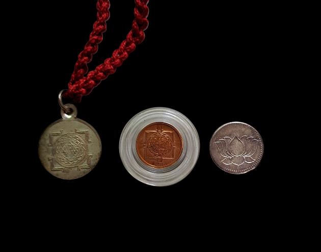 เหรียญพระพิฆเนศ ทองแดงปัดเงา ขนาด 1.5 ซม /ผ้ายันต์พระพิฆเนศ /แผ่นรูปบูชา หลังทองแดง 1 แผ่น เหรียญเงินแม่พระอุมาพร้อมเชือกแดง ขนาด 2ซม /เหรียญแม่ลักษมี ขนาด 1.5 ซม (ชุดจัดเต็ม โชคลาภ อำนาจบารมี)