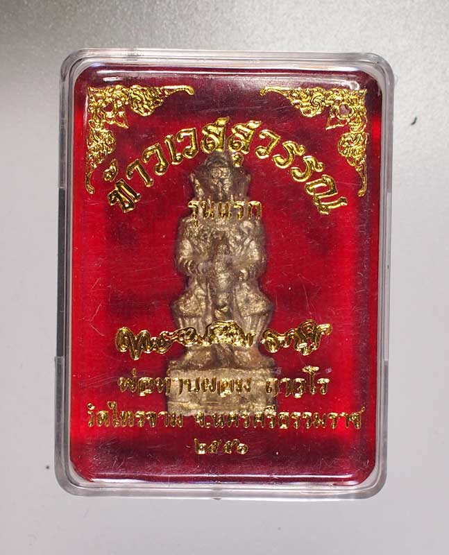 รายละเอียด รูปหล่อท้าวเวสสุวรรณ พ่อท่านผอม ถาวโร วัดไทรขาม อ.ท่าศาลา จ.นครศรีธรรมราช ปี พ.ศ.2557 จัดสร้างตามดำริของพ่อท่านเพียงเนื้อเดียว จำนวน 800 องค์ " # Sculpture of Vessuwan Luang Pu Phom Wat Trai Kgam Tha Sala Nakhon Si Thammarat B.E.2557 (Bronze) "" ท้าวเวสสุวรรณ เป็นเทพเจ้า หรือ เทวดา หรือ องค์มหาเทพ ในคติธรรมนิยมทางความเชื่อในพระพุทธศาสนา แบบแท้จริง ด้วยเป็น องค์มหาเทพ ที่มีหน้าที่ปกป้องคุ้มครองรักษาพระพุทธศาสนามาแต่ในครั้งพุทธกาล แต่เมื่อพระพุทธศาสนาแตกแยกออกเป็นสองนิกาย คือ มหายาน กับ หินยานหรือเถรวาท ที่นับถือกันในประเทศจีน ทิเบต ไต้หวัน สิงคโปร์ ...ท้าวเวสสุวรรณ จึงแบ่งแยกออกเป็นสององค์เหมือนกัน ... ที่เคารพกราบไหว้บูชาใน นิกายหินยาน นับถือในนาม เทพเจ้าไฉ่ซิ้งเอีย หมายถึง เทพเจ้าแห่งโภคทรัพย์ ความเจริญรุ่งเรือง ท้าวเวสสุวรรณ จึงถูกนำมาสร้างเป็นวัตถุมงคลในคติธรรมนิยมของพระพุทธศาสนาทั้งสองนิกาย ทางความเชื่อในแนวทางเดียวกัน และเป็นองค์มหาเทพที่ใกล้ชิดคุ้นเคยกับคนไทยเป็นอย่างดีด้วยเป็นเจ้าแห่งภูตผีปีศาจ ยักษ์มาร อสูรร้ายทั้งหลาย จึงมักนิยมที่จะอัญเชิญอำนาจของ ท้าวเวสสุวรรณ ปกป้องคุ้มครองทารกแรกเกิด ด้วยการติดผ้ายันต์ เหรียญหรือรูปเหมือนขององค์ท่าน ไว้ที่บ้านหลังนั้นๆ ท้าวเวสสุวรรณ ถือเป็นท้าวจตุโลกบาล หรือ เทวดาผู้คุ้มครองโลกประจำทิศอุดร ถือเป็นเจ้าพระยาคลังหลวง ธนบดีแห่งโภคทรัพย์ ราชาแห่งเศรษฐีผู้ร่ำรวย เงินทองมากมี จึงเป็นคติธรรมนิยมทางความเชื่อของชาวจีน ถือเป็นเทพเจ้าที่สำคัญ คือ องค์ไฉ่ซิ้งเอีย ที่ต้องกราบไหว้มาตั้งแต่บรรพบุรุษ ครั้นถึงวันตรุษจีน วันสารท วันประเพณีต่างๆจึงเป็นความเชื่อที่แตกต่างกันกับคติธรรมนิยมความเชื่อของคนไทย ท้าวเวสสุววณ จึงกลายเป็นสัญลักษณ์ของความมั่งคั่ง ยืนตระหง่านปากทางเข้าบ่อนคาสิโนหลายแห่งที่คนไทยขนเงินไปถมทะเลเสียที่นั้นปีละหลายแสนล้าน เป็นเรื่องจริงที่เกิดขึ้น จึงควรทราบว่า ผีการพนัน ยังเป็นลูกสมุนของท้าวเวสสุวรรณ เล่นอย่างไรก็มิอาจจะเอาชนะได้ อนุภาพแห่งองค์ท้าวเวสสุวรรณ ดีเด่นเป็นที่ประจักษ์ชัดแบบเกื้อกูลค้ำจุนให้อยู่เย็นเป็นสุข ปกป้องคุ้มครองให้แคล้วคลาดปลอดภัยจากภยันตรายทั้งปวง ความร่ำรวยที่ต่างถวิลหาแบบเสี่ยงโชคการพนัน และก็มีอานุภาพทำให้เสียทรัพย์ได้เช่นเดียวกัน.....