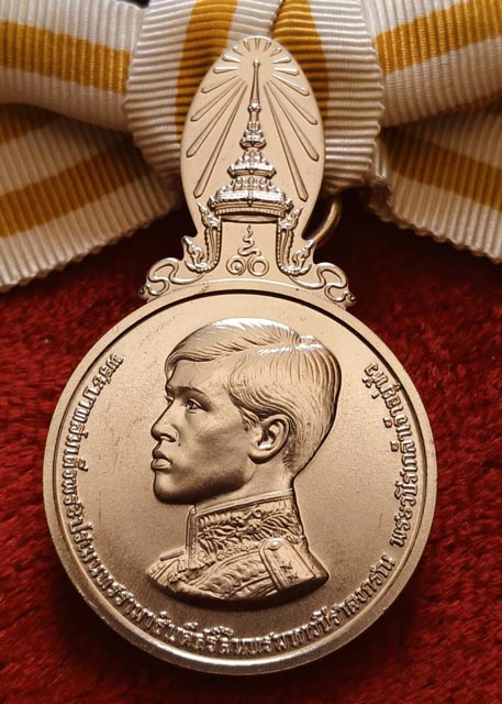 ด้านหน้า พระบรมรูปพระบาทสมเด็จพระปรเมนทรรามาธิบดีศรีสินทรมหาวชิราลงกรณ พระวชิรเกล้าเจ้าอยู่หัว ทรงฉลองพระองค์เครื่องแบบเต็มยศทหารมหาดเล็กรักษาพระองค์ในพระบาทสมเด็จพระปรมินทรมหาจุฬาลงกรณ์ พระจุลจอมเกล้าเจ้าอยู่หัว มีข้อความว่า พระบาทสมเด็จพระปรเมนทรรามาธิบดีศรีสินทรมหาวชิราลงกรณ พระวชิรเกล้าเจ้าอยู่หัว ด้านหน้าขอบเหรียญเบื้องบน มีเลข ๑๐ อุณาโลม ภายใต้พระมหาพิชัยมงกุฎ ใช้ห้อยกับแพรแถบ มีริ้วสีขาวนวลกับริ้วสีเหลืองสลับกัน ริ้วสีขาวนวล