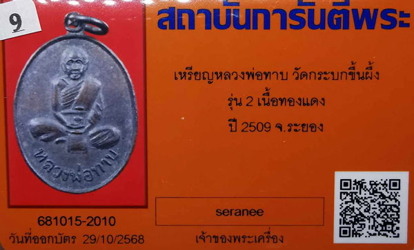 เหรียญพ่อทาบ วัดกระบกขึ้นผึ้ง รุ่น2 เนื้อทองแดง ห่วงเดิม ปี2509 จ.ระยอง + บัตรG-pra สภาพเดิมค่ะ |