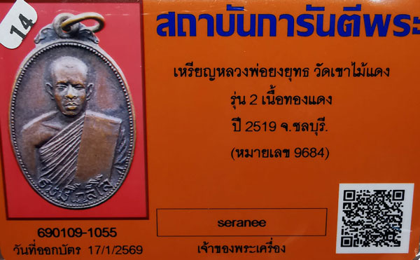 เหรียญหลวงพ่อยงยุทธ วัดเขาไม้แดง รุ่น2 เนื้อทองแดง ห่วงเดิม ปี2519 จ.ชลบุรี(หมายเลข9684) + บัตรG-pra สภาพเดิมค่ะ
