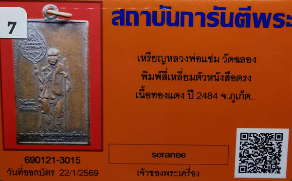 เหรียญหลวงพ่อแช่ม วัดฉลอง พิมพ์สี่เหลี่ยมตัวหนังสือตรง เนื้อทองแดง ห่วงเดิม ปี2484 จ.ภูเก็ต + บัตรG-pra สภาพเดิมค่ะ