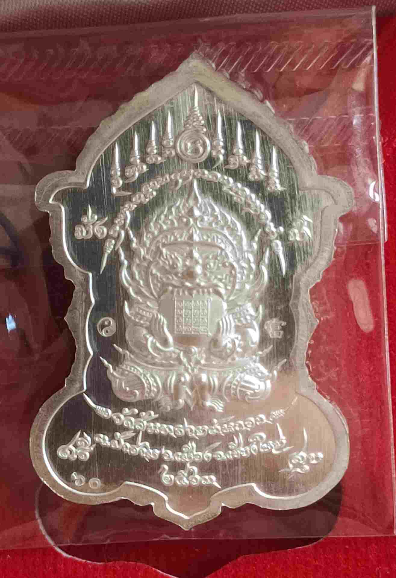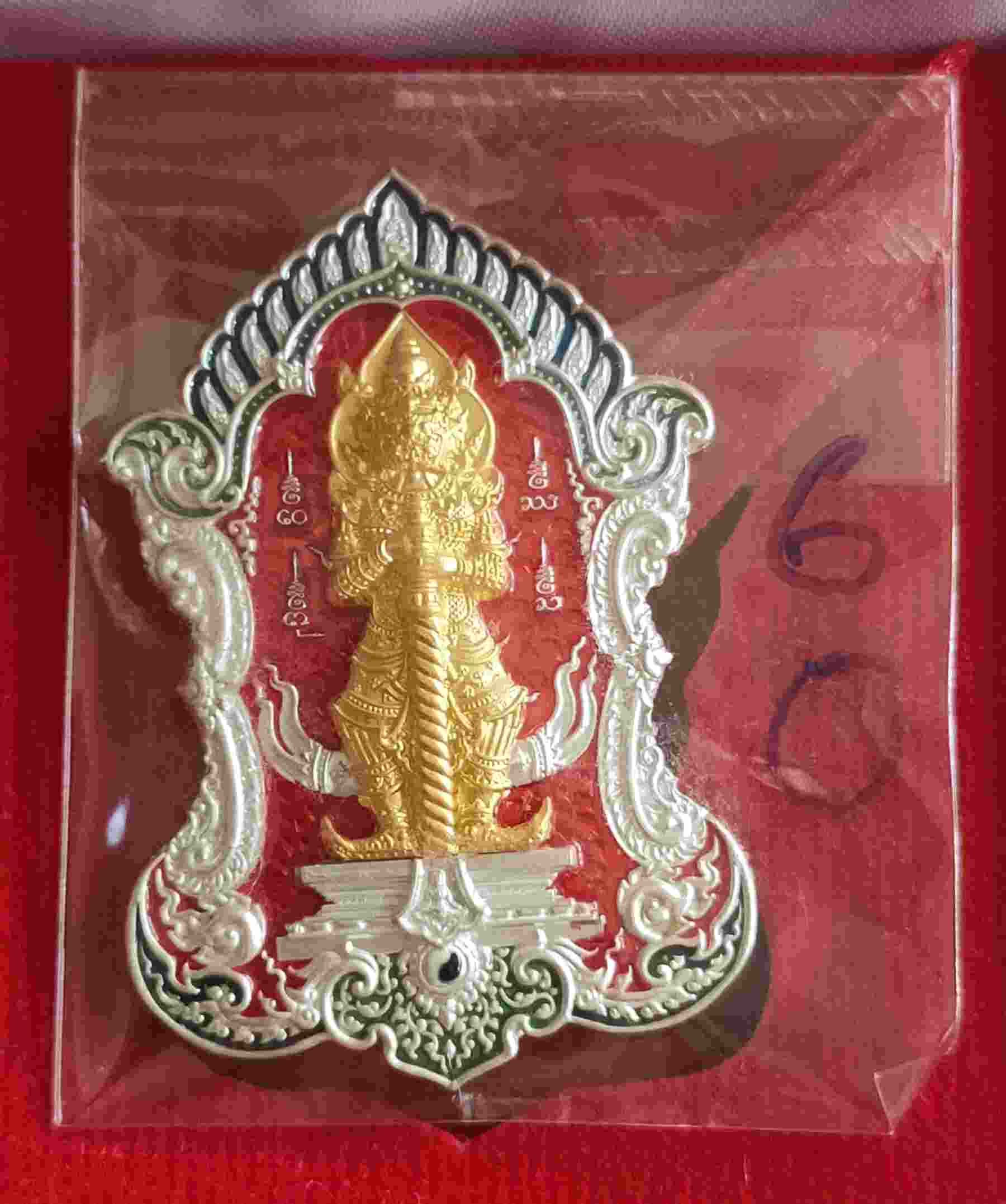 เหรียญท้าวเวสสุวรรณ วัดสันทรายต้นกอก รุ่นเจ้าสัว เนื้อเงินลงยาแดงหน้ากากทองคำ พร้อมกล่อง
