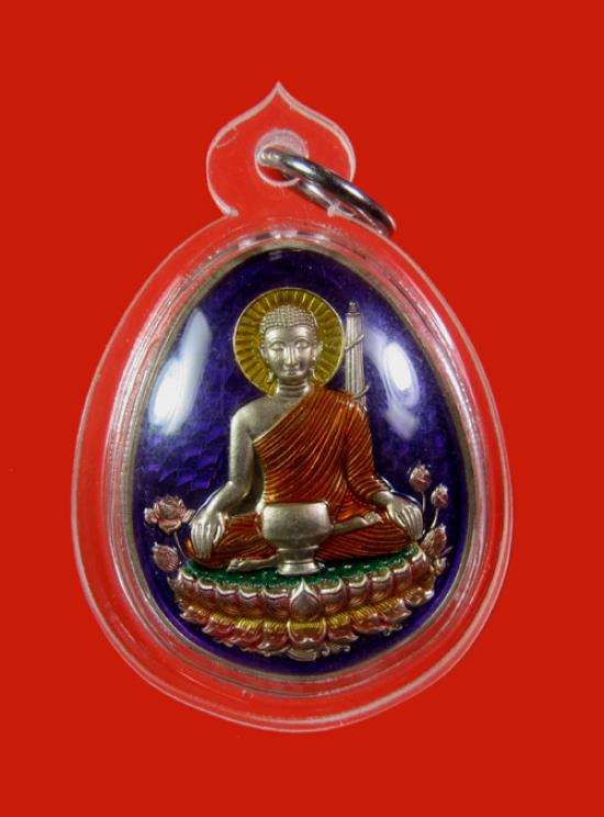 - หรียญพระสิวลี รุ่น สิริมงคล หลวงปู่มหาศิลา วัดโพธิ์ศรีสะอาด จ.กาฬสินธุ์ เนื้ออัลปาก้าคุ้ยพื้นลงยาสีม่วง จีวรส้ม ฐานบัว รัศมี ลงยา องค์ต้นแบบ เลข 168