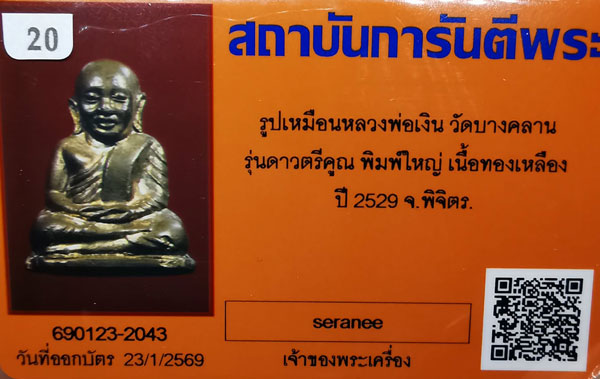 หลวงพ่อเงิน วัดบางคลาน รุ่นดาวตรีคูณ เนื้อทองเหลือง กริ่งดัง ปี2529 จ.พิจิตร + กล่องเดิม + บัตรG-pra สภาพสวยเดิมค่ะ