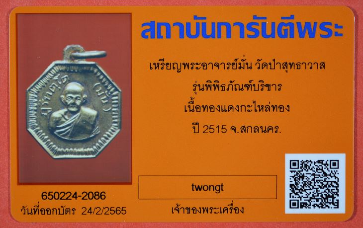 เหรียญแปดเหลี่ยมพระอาจารย์มั่น ภูริทัตโต วัดป่าสุทธาวาส รุ่นพิพิธภัณฑ์บริขารเนื้อทองแดงกระไหล่ทอง ปี 2515 จ.สกลนคร พร้อมบัตรรับรอง เคาะเดียวแดง