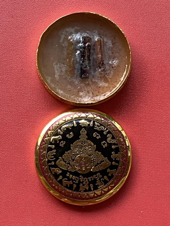 เคาะเดียวแดง สีผึ้งพระราหู รุ่น มงคลจักรวาล เนื้อ โลหะชุบทองลงยาสีดำขอบสีแดง ขนาด 5ซม |