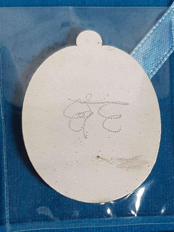 "วัดใจ" เหรียญสมปรารถนา เนื้อเงินไม่ตัดปีกหลังเรียบ+จารมือ ลงยาฟ้าจีวรเหลือง หมายเลข 16 ครูบาแบ่ง วัดบ้านโตนด จ.นครราชสีมา พ.ศ.2556