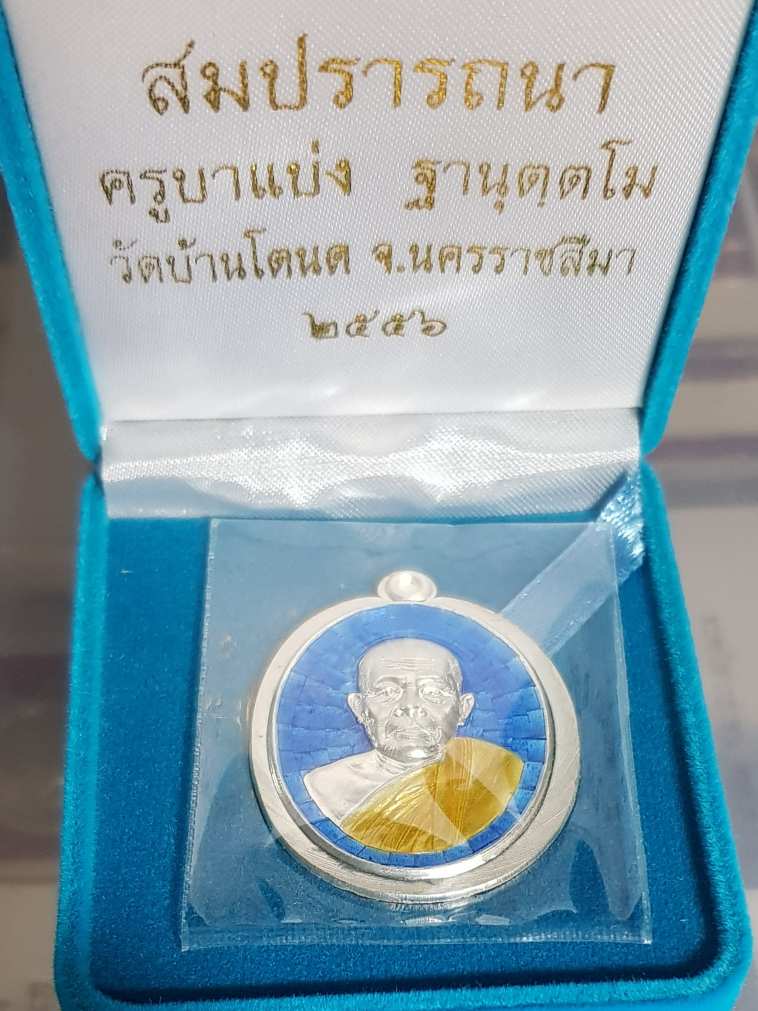 "วัดใจ"เหรียญสมปรารถนา เนื้อเงินไม่ตัดปีกหลังเรียบ+จารมือ ลงยาฟ้าจีวรเหลือง หมายเลข 16 ครูบาแบ่ง วัดบ้านโตนด จ.นครราชสีมา พ.ศ.2556