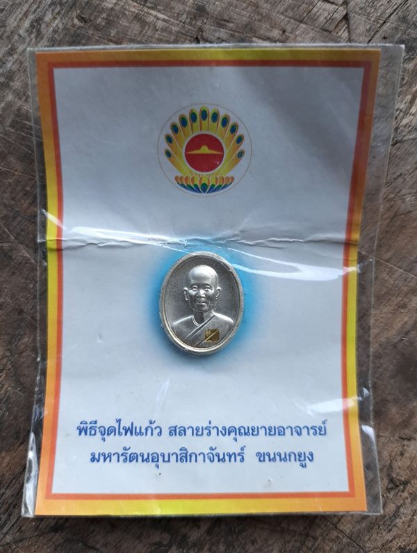 เหรียญพิธีจุดไฟแก้วสลายร่าง คุณยายอุบาสิกาจันทร์ ขนนกยูง พร้อมซองเดิม