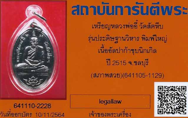 ผิวสวยเหมือนกระจก เงาวิ้ง เส้นสายคมชัดลึกทุกอักขระเลขยันต์ รับประกัน!!! องค์จริงสวยกว่าในรูปล้าน %(เนื่องจากผิวกระจกการถ่ายภาพจึงยากมาก ๆ ครับท่าน มีเงาสะท้อนเยอะมาก) เหรียญหลวงพ่ออี๋ วัดสัตหีบ จังหวัดชลบุรี รุ่นประดิษฐานวิหาร เนื้ออัลปาก้าชุบนิเกิล พ.ศ.๒๕๑๕ องค์นี้เป็นพิมพ์ใหญ่ บล็อกนิยมสุด และหายากที่สุด องค์นี้สวยที่สุดจริง ๆ สภาพสวยกริ๊บแชมป์ออฟเดอะแชมป์แน่นอนทุกที่ทุกเวลาทุกสนามครับ และสวยทุกสายตาด้วยครับแม้กระทั่งการออกบัตรรับรองพระแท้ของสถาบันการันตรีพระอันเป็นสถาบันออกบัตรรับรองพระแท้ระดับประเทศยังระบุว่าเหรียญนี้สภาพสวยเลยครับท่าน ท่านจึงมั่นใจได้ว่าเหรียญนี้เป็นพระดี พระแท้ และพระสวยมากสภาพแชมป์ประเทศไทยแน่นอนล้าน % ครับผม