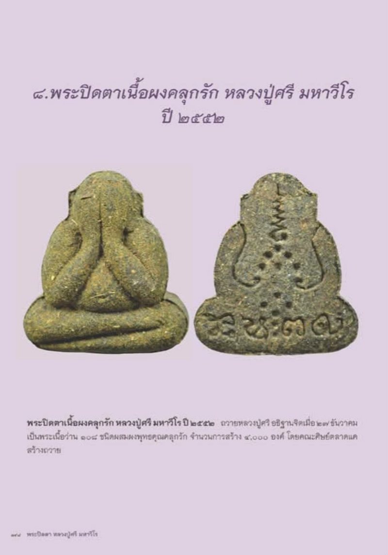 พระปิดตาเนื้อว่านคลุกรัก หลวงปู่ศรี มหาวีโร วัดป่ากุง ร้อยเอ็ด ปี๒๕๕๒ ถวายหลวงปู่ศรี อธิฐานจิตเมื่อ ๒๗ ธันวาคม เป็นพระเนื้อว่าน ๑๐๘ ชนิดผสมผงพุทธคุณคลุกรัก จำนวนการสร้าง ๔,๐๐๐ องค์ โดยคณะศิษย์ตลาดแค สร้างถวาย... ขนาดองค์พระ สูง 2.5 ซม. กว้าง 2.2 ซม.