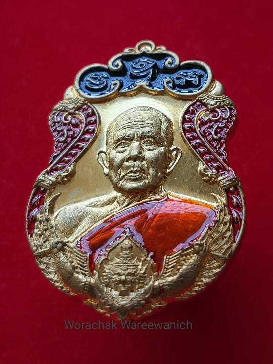 เหรียญเสมา รุ่น "ราชันย์พันล้าน" หลวงปู่หา สุภโร วัดสักกะวัน อ.สหัสขันธ์ จ.กาฬสินธุ์ ปี ๒๕๖๔ เนื้อทองทิพย์ ลงยาขอบแดง-น้ำเงิน ลงยาจีวร ด้านหลังตอกโค๊ต เลข ๓๔ เลขเรียง เลขสองหลัก สวยเดิม จมูกโด่ง พร้อมกล่องเดิมครับ
