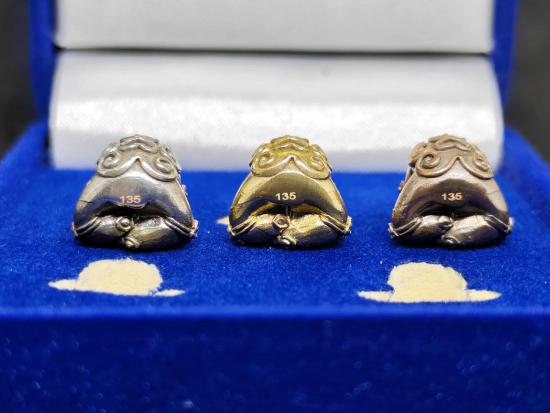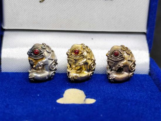 กบกินเดือนจิ๋วล้มลุก ปลุกให้รวย รุ่น 1 ชุดของขวัญ 3 องค์ เนื้อทองรัตนะ, เนื้อชนวนชุบ 2k และเนื้อเบญจโลหะ หมายเลข 135 ครูบาวิมะละ วิมาโล สำนักสงฆ์พระธาตุดอยจอมแวะ อ.เชียงดาว จ.เชียงใหม่