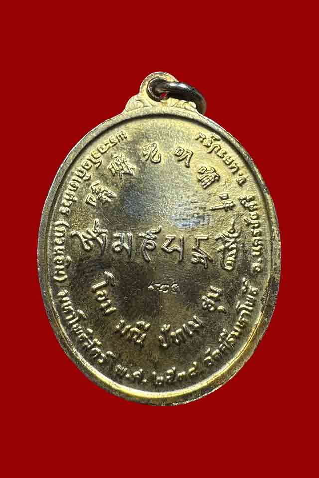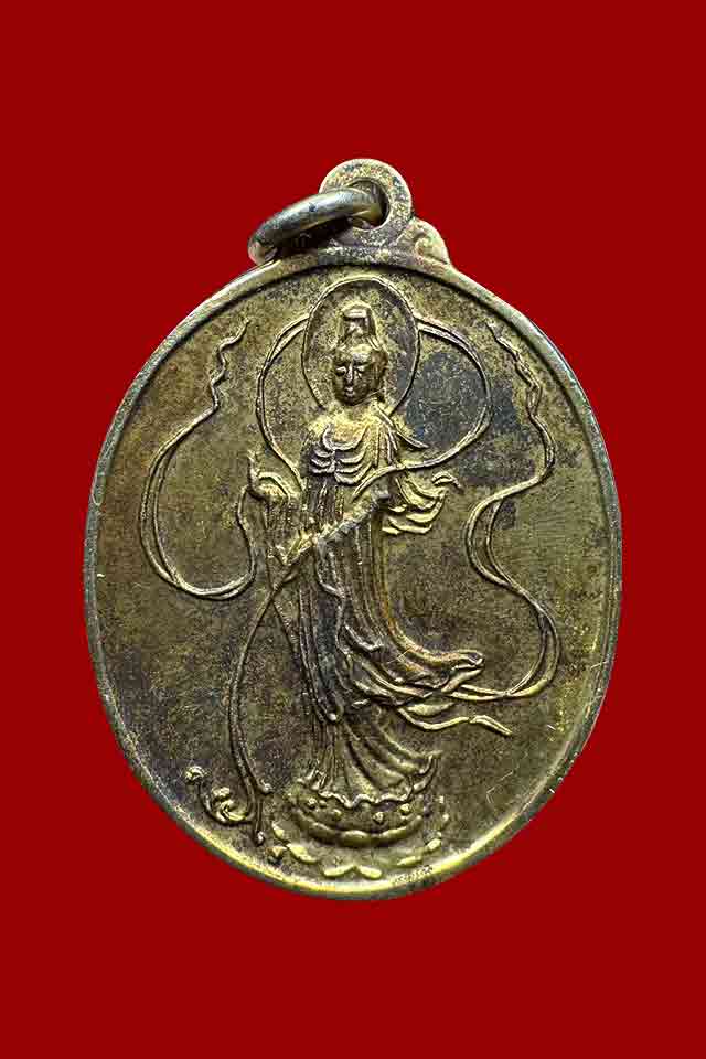 วัดศรีมหาโพธิ์ เหรียญ เจ้าแม่กวนอิม พิมพ์ยืนเต็มองค์ เนื้อทองแดง หลังยันต์ ปี 38