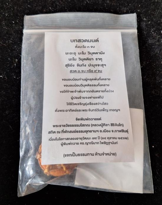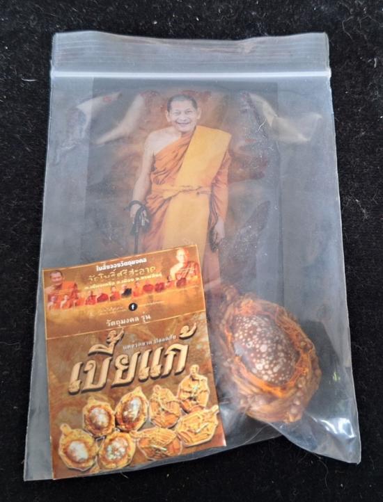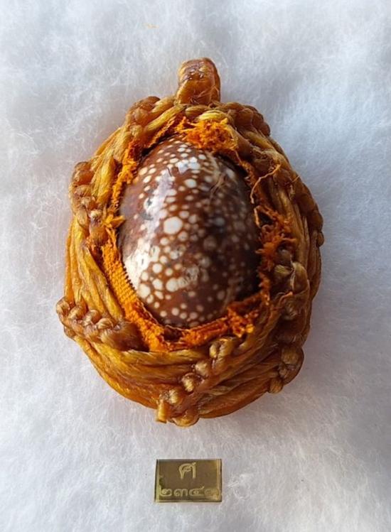 เบี้ยแก้ หุ้มจีวร ถักเชือก หลวงปู่ศิลา วัดโพธิ์ศรีสะอาด มีแผ่นเลขกำกับ ฝังตะกรุดทองเหลือง พร้อมใบคาถา ปี2567