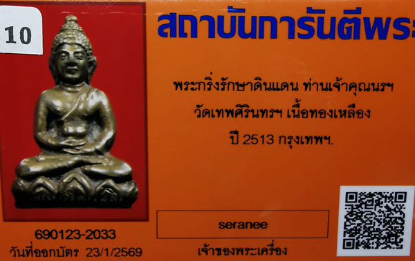 พระกริ่งรักษาดินแดน ท่านเจ้าคุณนรฯ วัดเทพศิรินทร์ฯ เนื้อทองเหลือง กริ่งดัง ปี2513(ตอกโค้ต) กรุงเทพฯ + บัตรG-pra สภาพเดิมค่ะ