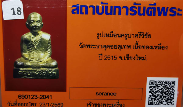 รูปเหมือนครูบาศรีวิชัย วัดพระธาตุดอยสุเทพ เนื้อทองเหลือง ปี2515 จ.เชียงใหม่ + บัตรG-pra สภาพเดิมค่ะ