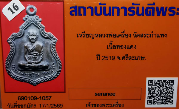 เหรียญหลวงพ่อเครื่อง วัดสระกำแพง เนื้อทองแดง ปี2519 จ.ศรีสะเกษ + บัตร G-pra สภาพเดิมค่ะ