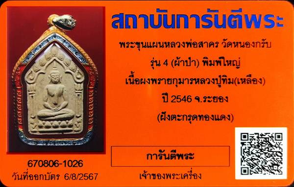 พระขุนแผนหลวงพ่อสาคร(สร้าง90องค์)วัดหนองกรับ รุ่น 4 (ผ้าป่า) พิมพ์ใหญ่ เนื้อผงพรายกุมารหลวงปู่ทิม(เหลือง) ปี 2546 จ.ระยอง (ฝังตะกรุดทองแดง)พร้อมบัตรG....