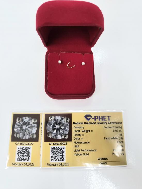 ต่างหูเพชร น้ำหนักข้างละ 0.07 กรัม ตัวเรือน 9K พร้อมบัตร G-PHET