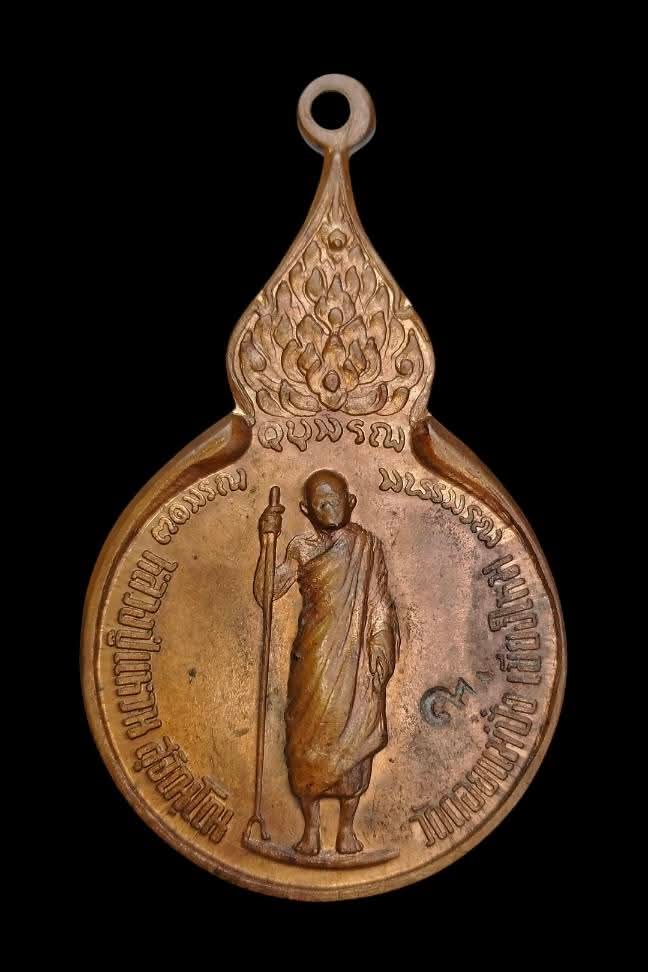 พระเหรียญ ลป.แหวน สุจิณโณ วัดดอยแม่ปั๋ง ยืนถือไม้เท้า รุ่นรวมใจ ปี2518 เนื้อทองแดง ตอกโค๊ดสวยงาม