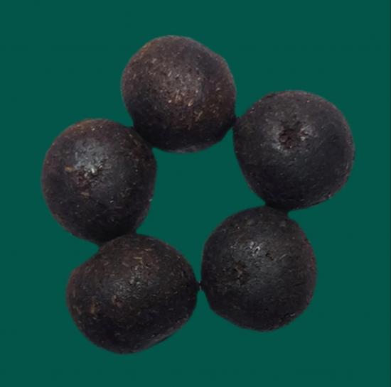 เม็ดยาเนื้อเข้มแก่มวลสาร ขนาดลูกประมาณ 0.8 ซม. |